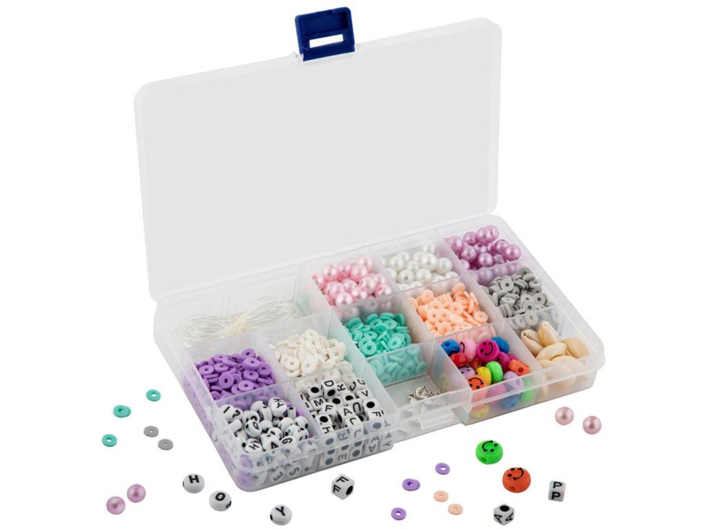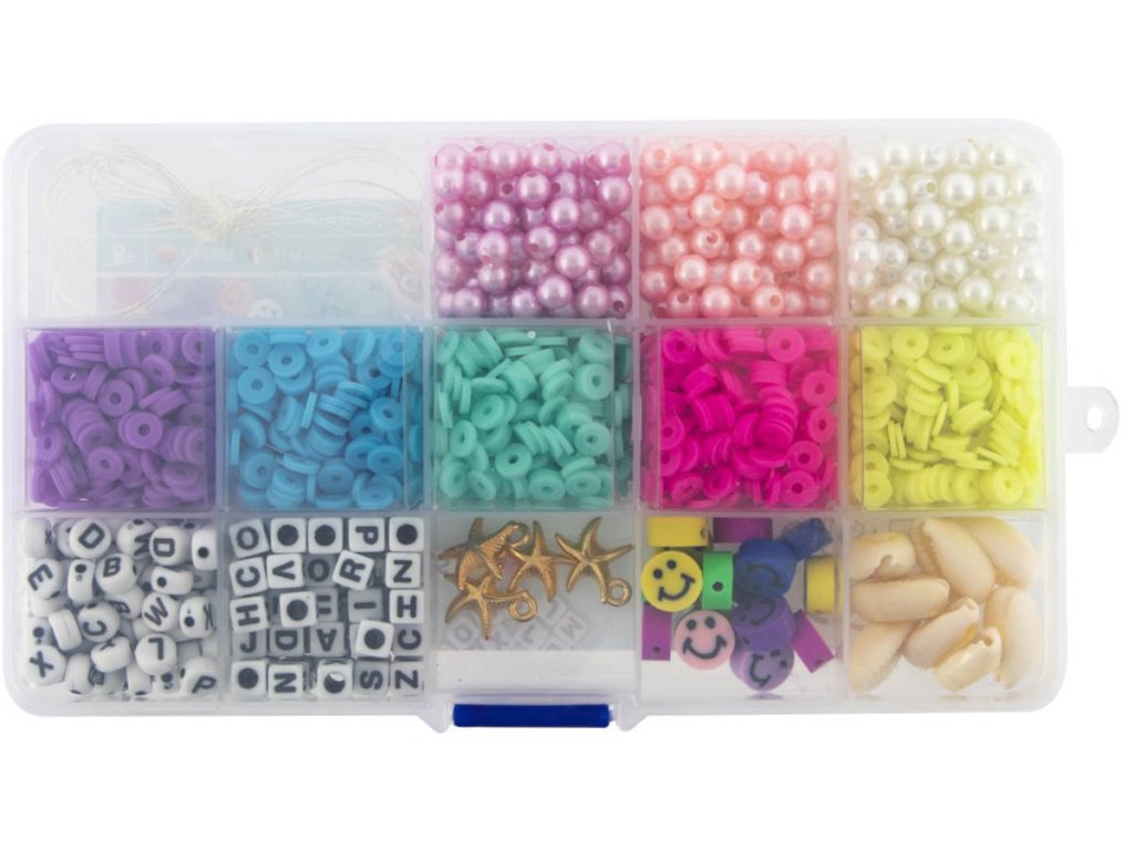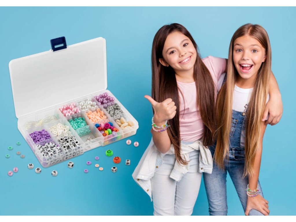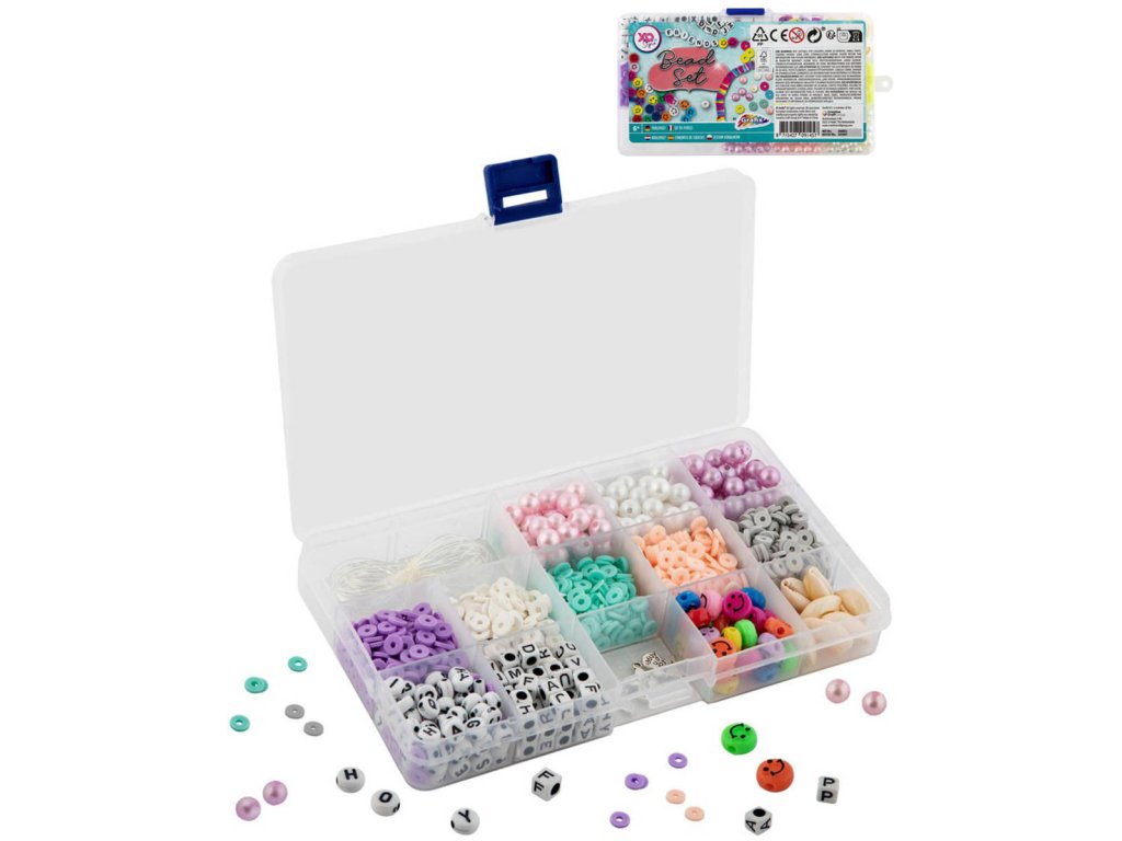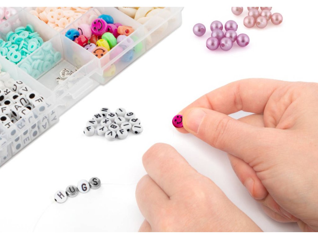 Sada navlélacích korálků včetně vlasce a prívěsků. Sada obsahuje různé druhy korálků (písmenka, perličky, ploché, kulaté, mušličky). Uloženo v praktickém plastovém boxu. Výroba dětské bižuterie.