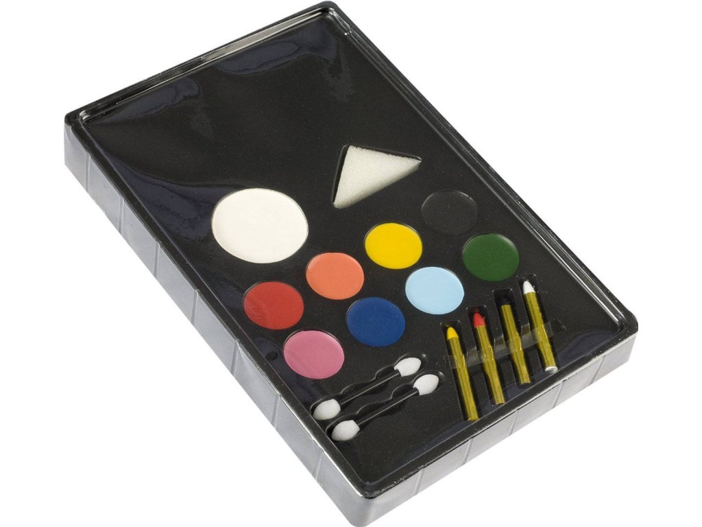 Obsah balení: 9x barva na obličej (bílá, červená, oranžová, žlutá, černá, růžová, modrá, světle modrá, zelená), 4x tužka na obličej (žlutá, červená, černá, bílá), houbička, 2x aplikátor