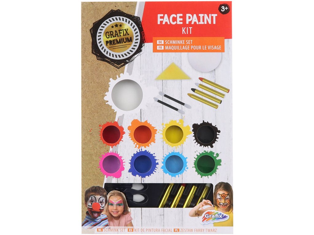 Grafix Premium Face Paint Kit - Dětské barvy na obličej. Součástí 9 barviček a 4 barevné tužky s doplňky.