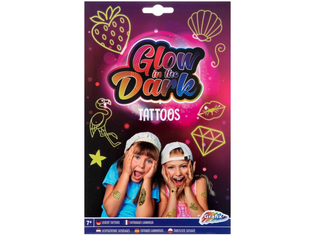 Grafix dočasné dětské tetování, které svítí ve tmě (fosforeskuje). 2 varianty - klučičí / holčičí tetovačky. Celkem 23ks.
