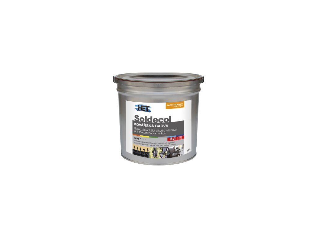 Het Soldecol samozákladující jednosložková alkyd-uretanová barva na kov samozákladující s obsahem železité slídy, grafitu a metalických pigmentů určená pro venkovní i vnitřní antikorozní nátěry železných kovů nebo vhodně upravených neželezných kovů – pozink, měď, hliník, apod. Barva je určena zejména k nátěrům kovaných výrobků, ocelových konstrukcí, mříží, bran, plotů, vrat, zábradlí, kovaného nábytku, laviček, pouličního osvětlení, apod. Nátěr odolává působení povětrnostních vlivů. Je vhodný též k renovacím starých (soudržných) nátěrových systémů. Hlavní předností jsou přímé nátěry železných kovů bez nutnosti použití základní barvy (tzv. 3 v 1 - základ, mezivrstva, vrchní email). V agresivním prostředí je vhodná kombinace se základní barvou. Díky tixotropnímu charakteru barva nevykazuje sklony ke stékání a lze ji nanášet ve velkých tloušťkách. Barva je vysoce nanášivá (HB - high build), vyhovuje tak aplikacím s požadavkem nanášení velkých tlouštěk jedním nástřikem (nad 70 µm suchého filmu [DFT]).