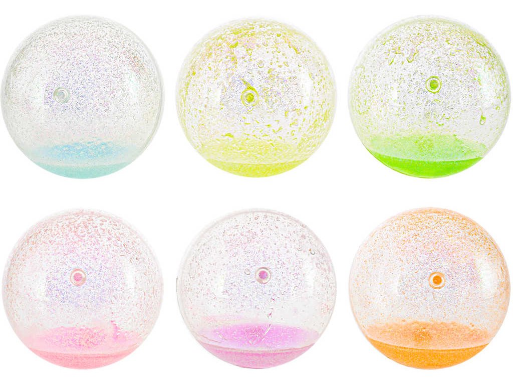 Průhledný plastový transparentní balónek s tekutinou s giltry uvnitř, v různých pastelových barvách.