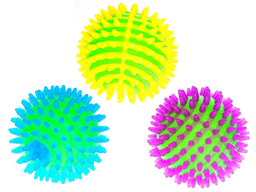 Měkký, bodlinatý balonek ve veselých barvách, který po nárazu na tvrdý předmět začne barevně blikat. Ostnatý balónek ve třech barvených variantách. Hračka na baterie, se světlem. Baleno volně.