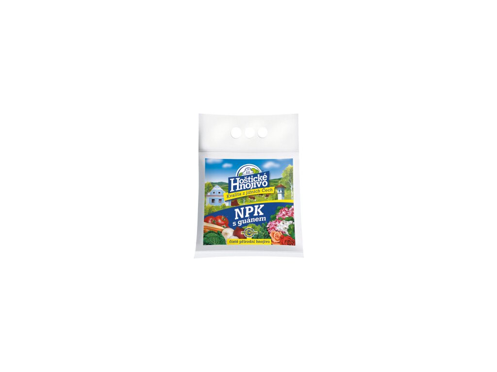 Hoštické hnojivo NPK s guánem je čistě přírodní organické hnojivo bez přídavku průmyslově vyráběných složek. Obsahuje základní živiny NPK (5% N, 2% P2O5, 8% K2O) a přírodní guáno pocházející z trusu mořských ptáků, což zajišťuje bohatý obsah stopových prvků.