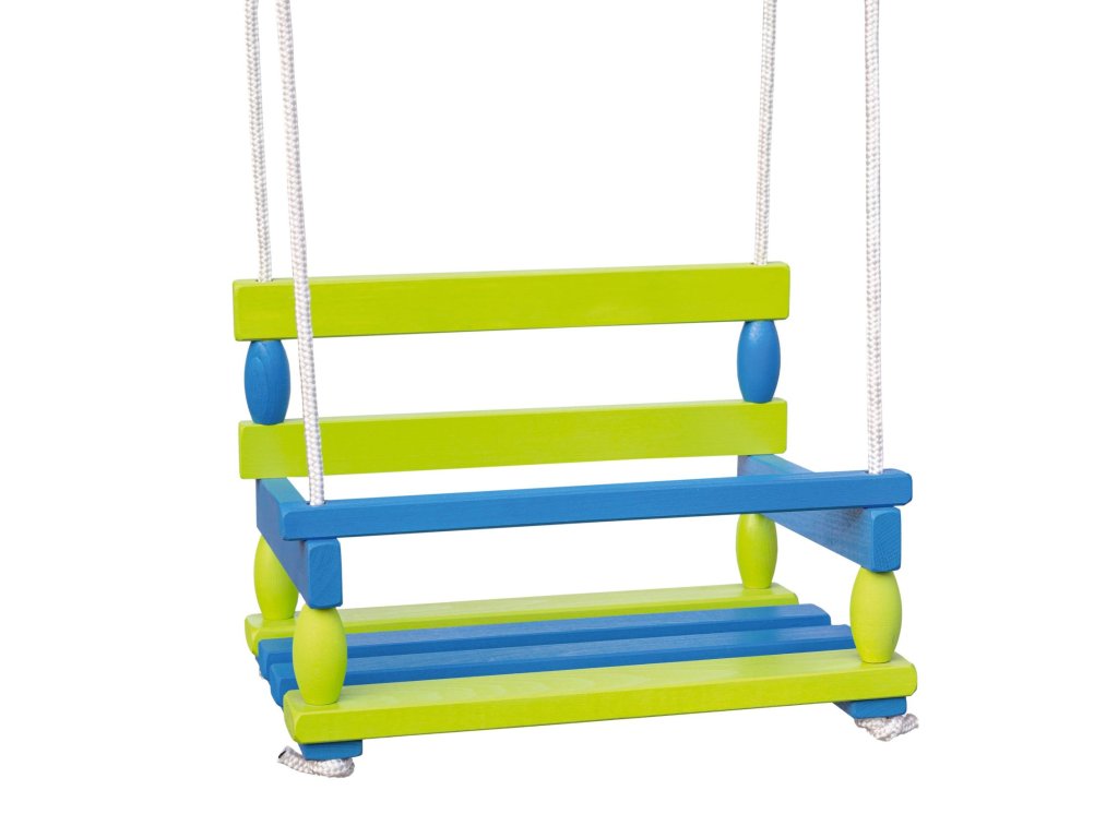 Krásná dřevěná houpačka v modro zelené barvě. Vhodná pro použití doma i na zahradě. Houpačka je bezpečná a stabilní.