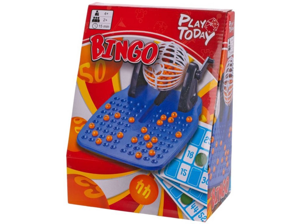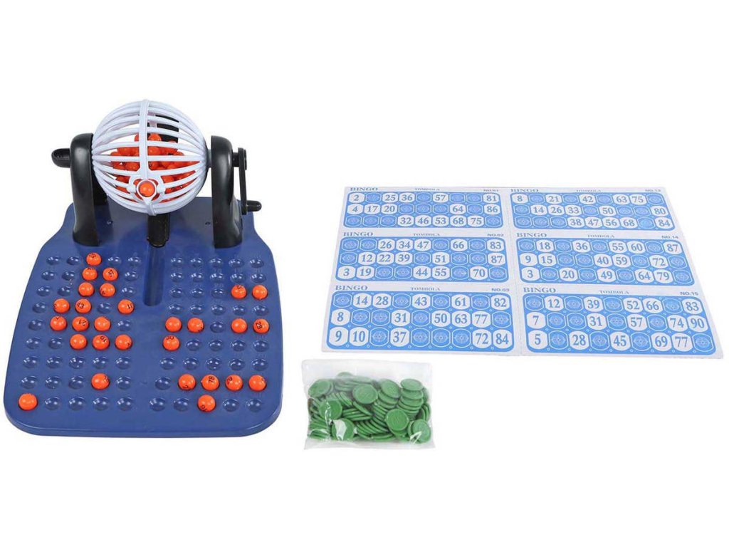Stolní společenská hra Bingo. Herní set obsahuje plastový mechanický losovací stroj, míčky, žetony a karty.