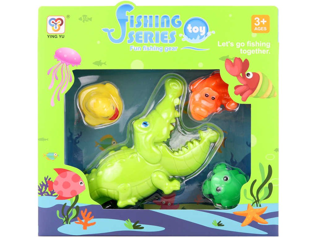 Baby hračka do vany s krokodýlem a zvířátky. Pomocí krokodýla lze lovit zvířátka ve vodě. Balení obsahuje krokodýla a 3 gumová zvířátka.