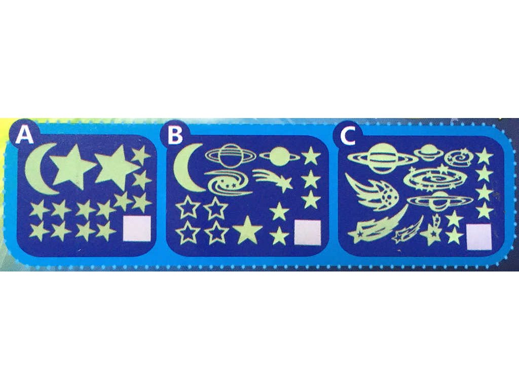 Vytvořte si svou vlastní hvězdnou oblohu v dětském pokojíčku s těmito, ve tmě svítícími (fosforeskujícími), objekty oblohy. Určeno pro hladké plochy (stěny, dveře, skříně). Navozují