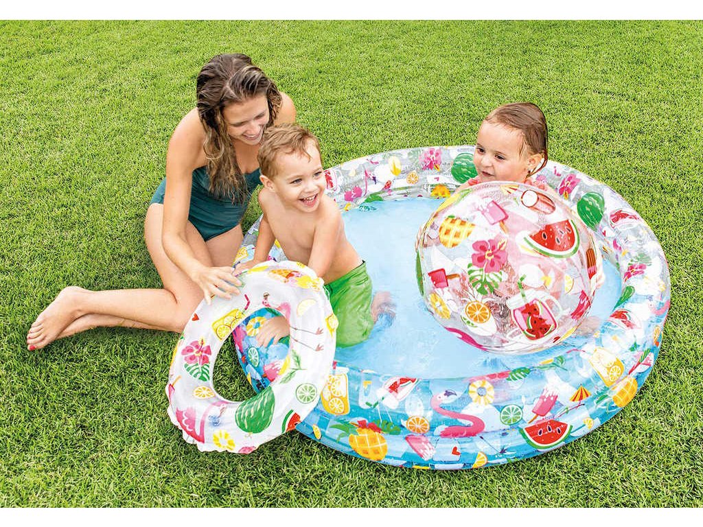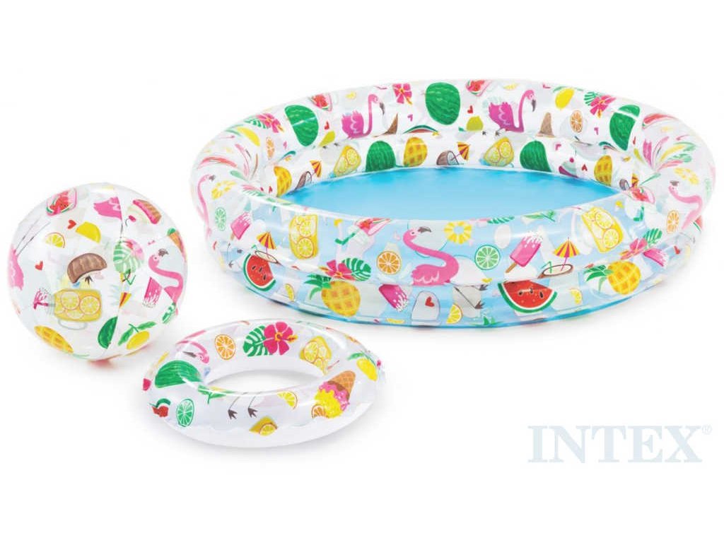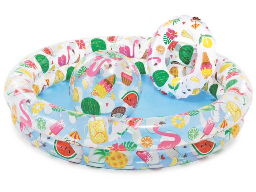 Praktická sada kruhového nafukovacího bazénu, plavacího kruhu a nafukovacího míče s veselým letním potiskem. Bazén je vyroben z masivního testovaného vinylu. Baleno v krabici.