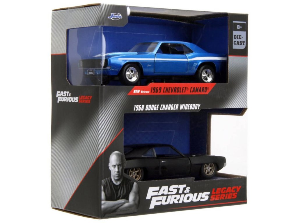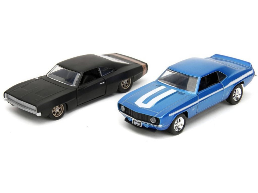 Kovové modely aut z filmu Rychle a zběsile ve dvojbalení - Chevrolet Camaro 1969 a Dodge Charger Wide Body 1968, volnoběh, otevírací dveře, měřítko 1:32, velikost 13 cm. Wave 2/1.