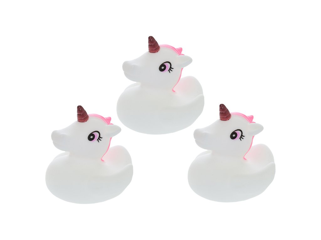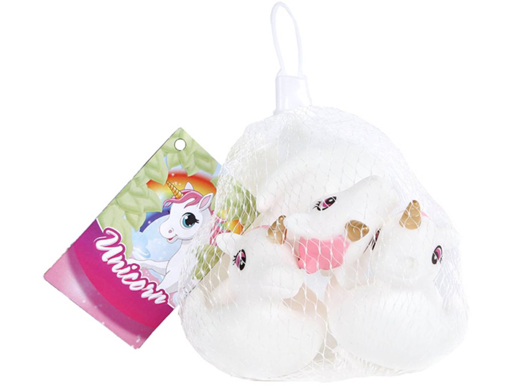 Originální pískací "kačenky" do vany, v podobě bílého jednorožce, s otvorem ve spodní části (píská, stříká vodu). Baleno po třech kusech v síťce.