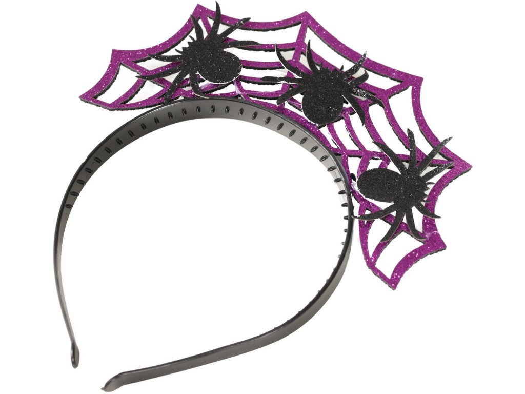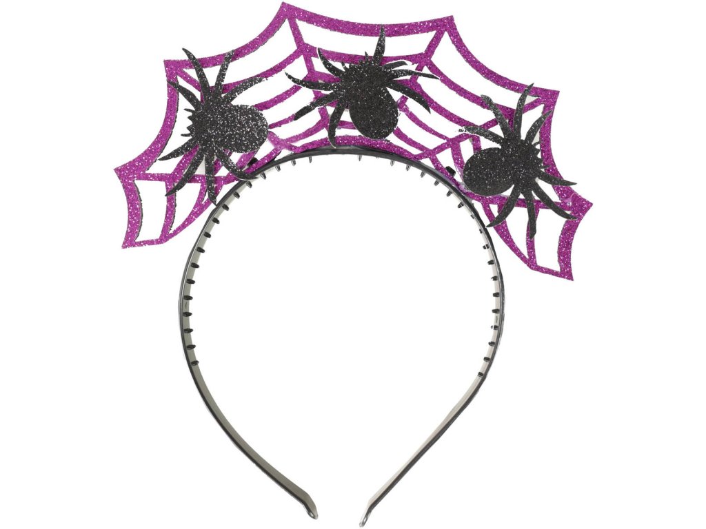 Nepřehlédnutelná čelenka s fialovou pavučinou a černými pavoučky je senzačním doplňkem na párty či karneval. Ideální do vlasů při oslavě čarodějnic nebo halloweenu.