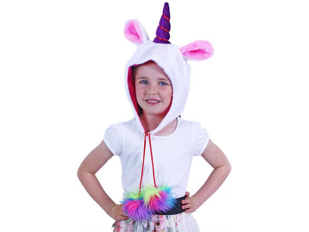 Senzační bílo - růžová plyšová čepice jednorožec s barevnými bambulkami a fialovým rohem. Super doplněk na karnevalovou párty!