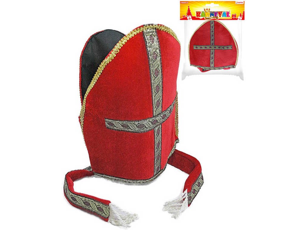 Látková červená čepice pro opravdové Mikuláše! Čepice je vyrobena z filcu a je dekorována zlatým vyšíváním. Perfektní doplněk ke kostýmu pro starší děti nebo dospělé. Baleno v sáčku.