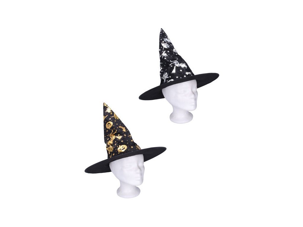 Černý čarodějnický špičatý klobouk ve dvou variantách. Tento klobouk se bude hodit jako doplněk pro správnou čarodějnici. Proměňte svou ratolest v mžiku v čaroděje, nebo čarodějnici, díky stylovému klobouku.