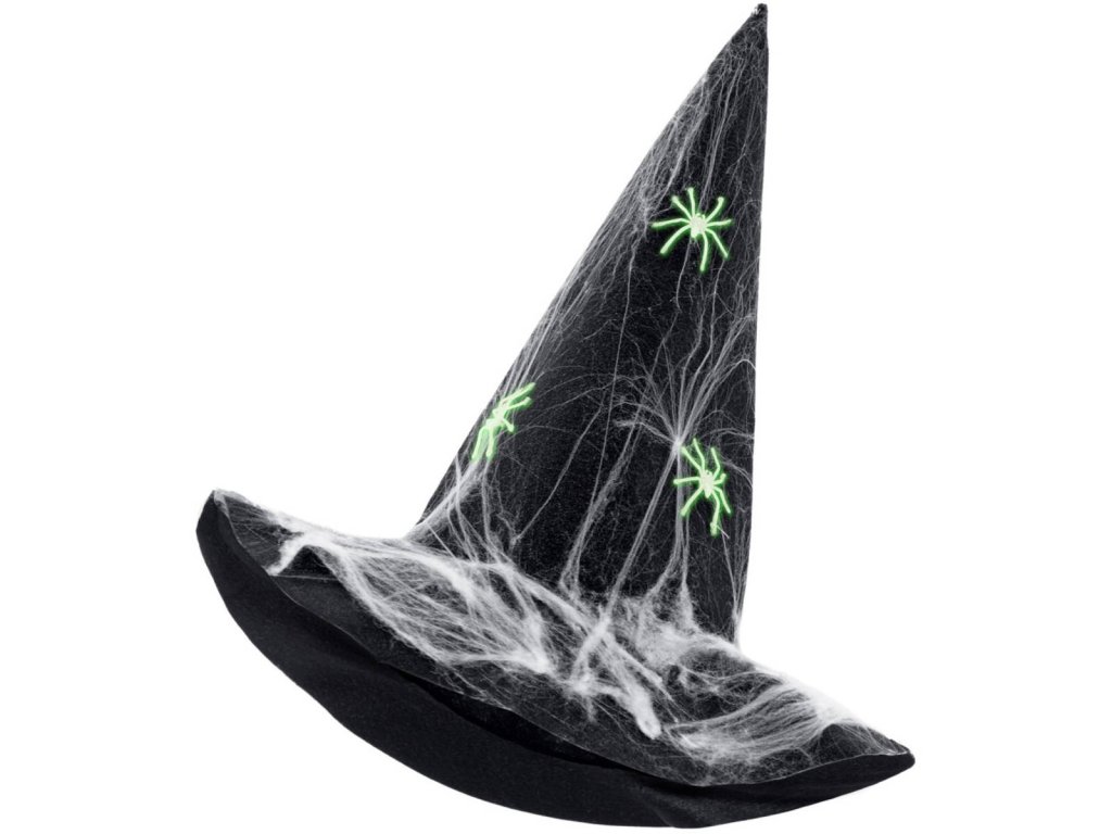 Premium čarodějnický černý špičatý klobouk s pavučinami a ve tmě svitícími pavouky, o velikosti 50 x 64 x 55cm. Vhodné jako doplněk ke karnevalovému kostýmu "Čarodějnice".