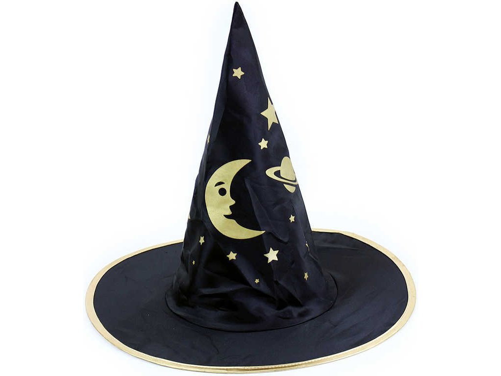 Čarodějnický klobouk je skvělým doplňkem tvého kostýmu! Klobouk černé barvy je zdoben zlatými motivy (noční obloha, měsíc, hvězdy, planety).