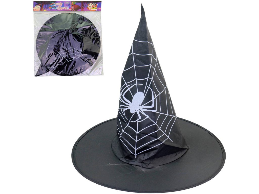 Špičatý černý klobouk pro čarodějnice a čaroděje. Bílý potisk pavučina s pavoukem, doplněk ke kostýmu Čarodějnice, na karneval.
