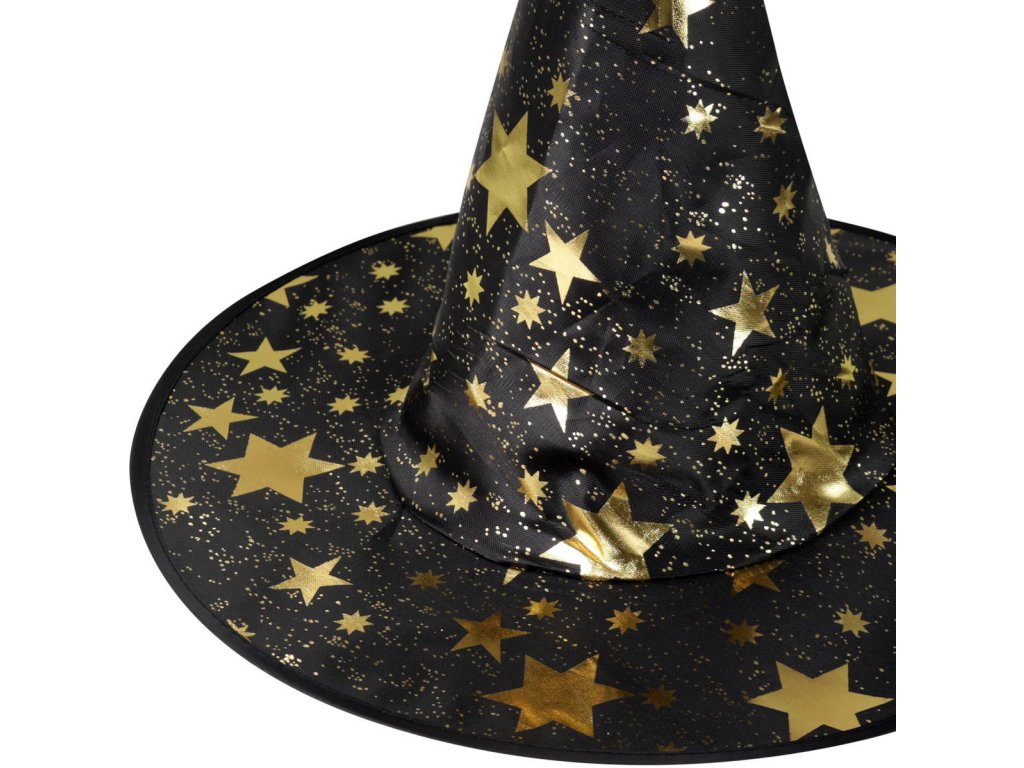 Úžasný špičatý klobouk v černé barvě s potiskem zlatých hvězdiček, pro všechny malé čaroděje. Ideální i na halloweenský večírek nebo karneval!