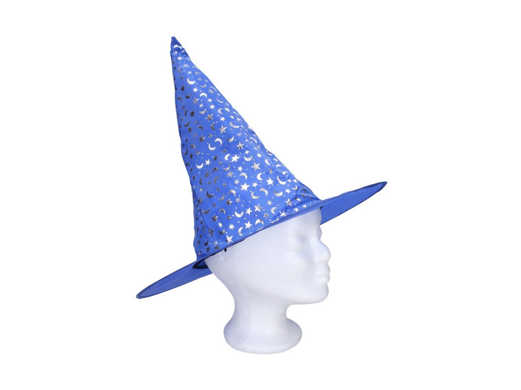 Špičatý čarodějnický klobouk modrý + stříbrný potisk měsíc a hvězdy, doplněk ke karnevalovému kostýmu čarodějnice.