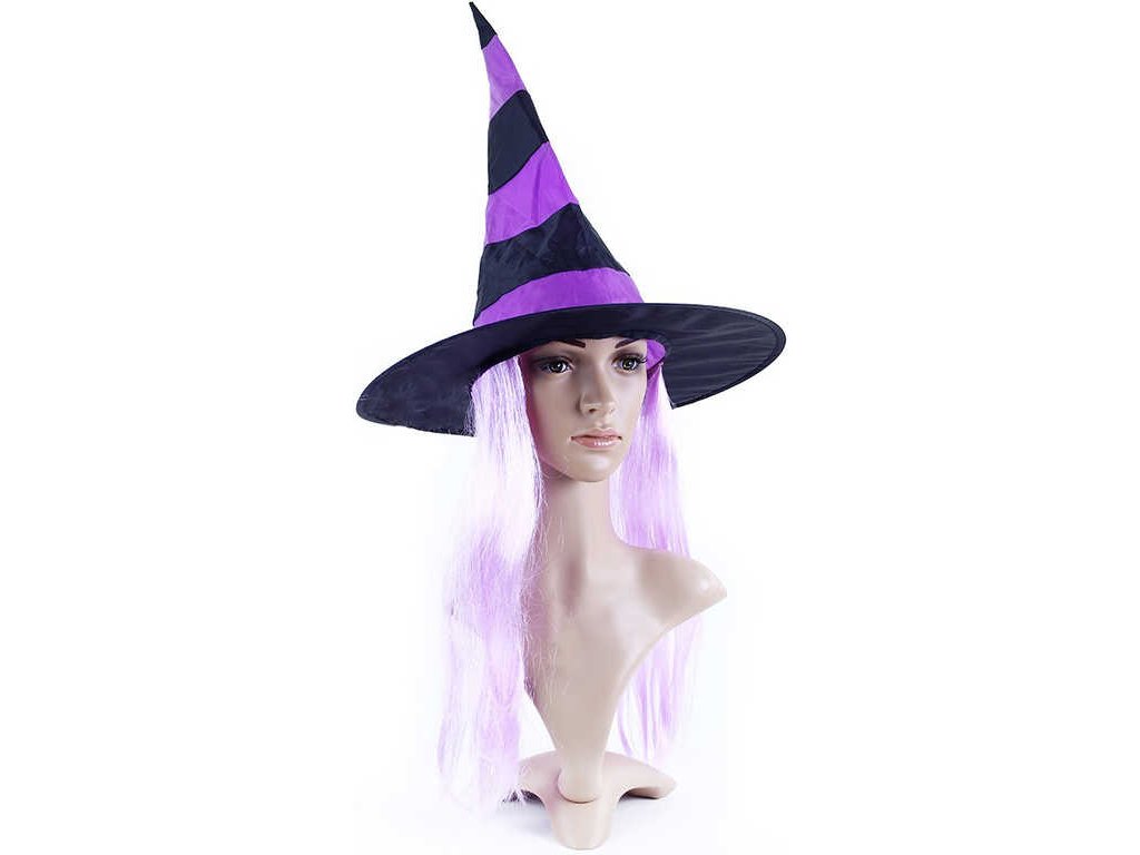 Čarodějnický klobouk černo-fialové barvy je dekorován světle fialkovými vlasy. Perfektní doplněk na Halloween párty nebo karneval!