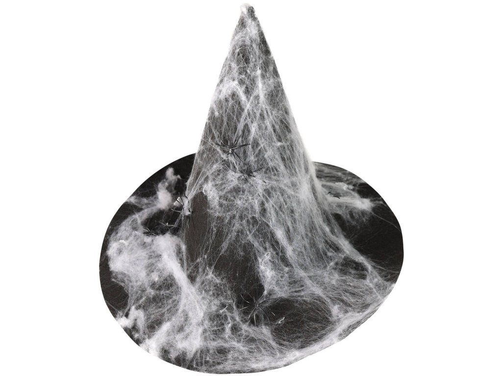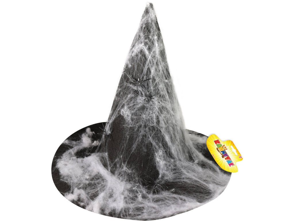 Čarodějnický klobouk s pavučinou, která vypadá jako opravdová! Klobouk černé barvy je určen pro dospělé, je potažen pavučinou a mini pavouky. Klobouk je vyroben z filcu. Perfektní doplněk na Halloween párty nebo karneval!