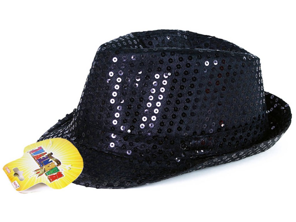 Třpytivý černý flitrový klobouk ve stylu Disko. Vhodné na párty či karneval, jako doplněk ke kostýmu. Klobouček na baterie, s LED světlem.