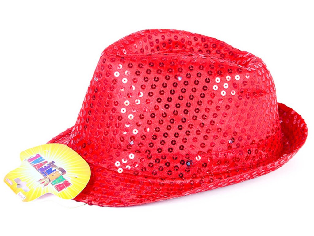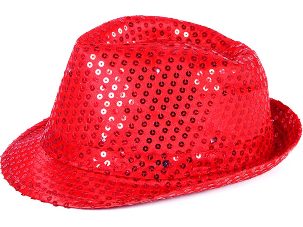 Třpytivý červený flitrový klobouk ve stylu Disko. Vhodné na párty či karneval, jako doplněk ke kostýmu. Klobouček na baterie, s LED světlem.