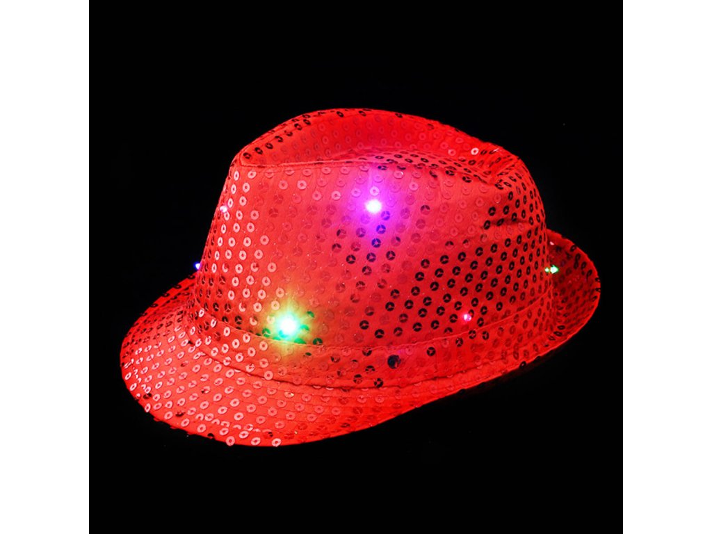 KARNEVAL Klobouk disco červený s flitry na baterie barevné LED Světlo