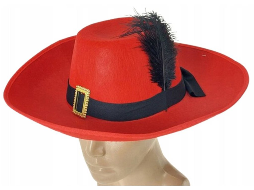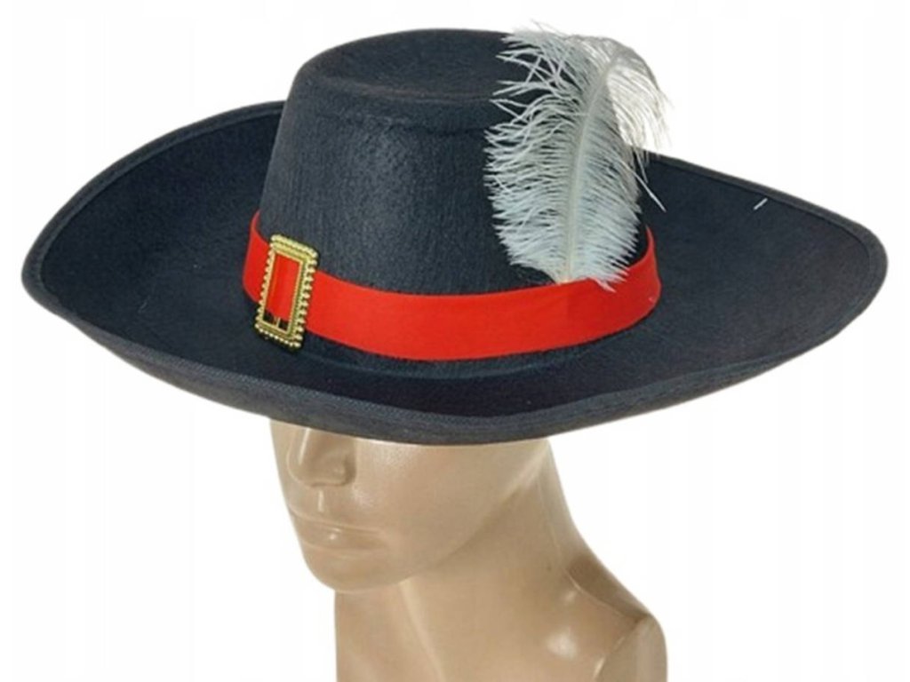 Mušketýrský klobouk s ozdobnou stuhou, pírkem a sponou. Doplněk ke karnevalovému kostýmu. 2 barevné varianty. Velikost 38 x 35 x 11cm.