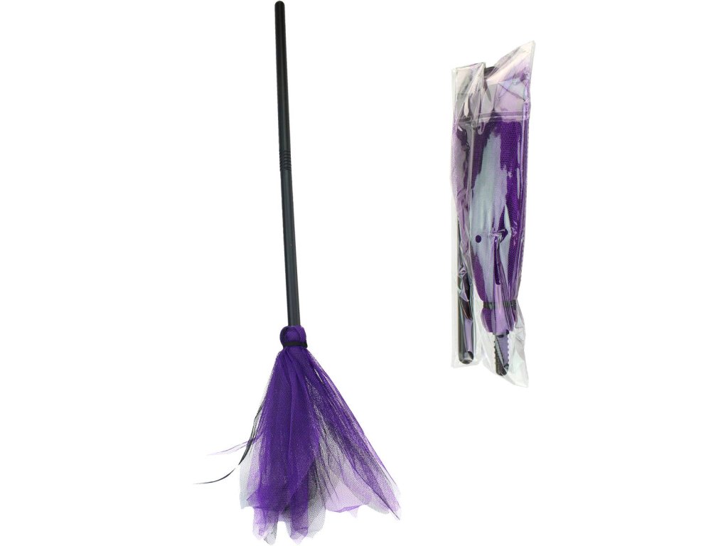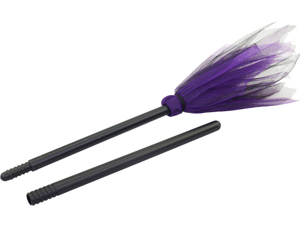 Fialové sestavitelné čarodějnické koště s černou plastovou rukojetí, doplněk ke kostýmu Čarodějnice, na karneval.