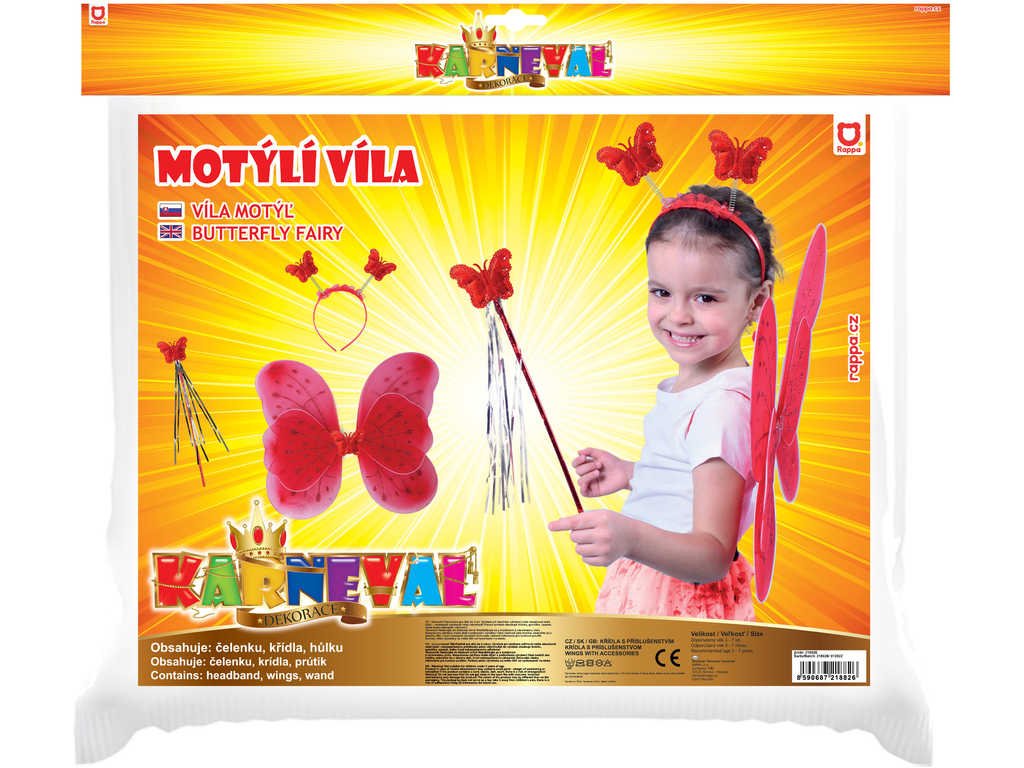 Roztomilá červená motýlí křidélka na gumičku jsou určena pro holčičky ve věkovém rozmezí 3-10 let (výška dítěte 104-150cm). Součástí této karnevalové sady je také čelenka s motýlky na pružinkách a
