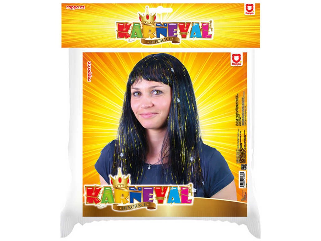 Karnevalová paruka v černé barvě je zdobená zlatými vlásky a stříbrnýma hvězdičkama. Perfektní doplněk na karneval nebo párty!