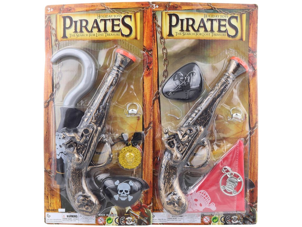 Dětská plastová pirátská sada. Součástí bambitka o velikosti 27cm, páska na oko, náušnice, hák, šátek a další doplňky. 2 varianty provedení.