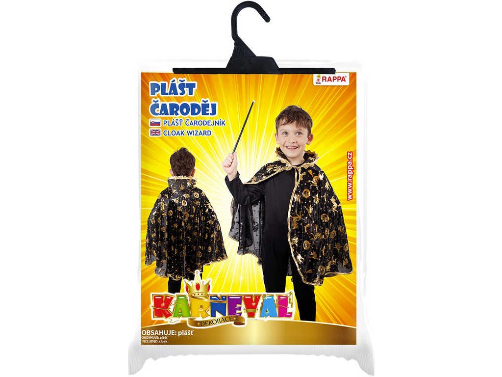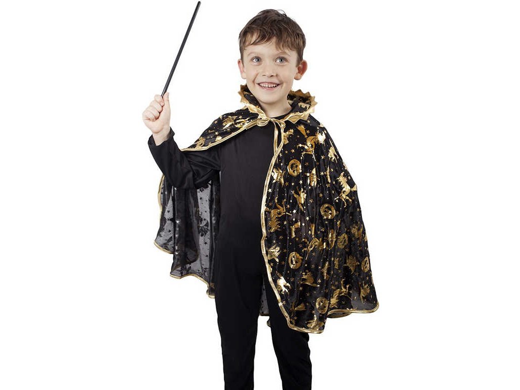 Krásný plášť na karneval nebo Halloween! Černý plášť je dekorován halloweenskými motivy zlaté barvy. Senzace! Doporučeno pro děti ve věkovém rozmezí 3-10 let.