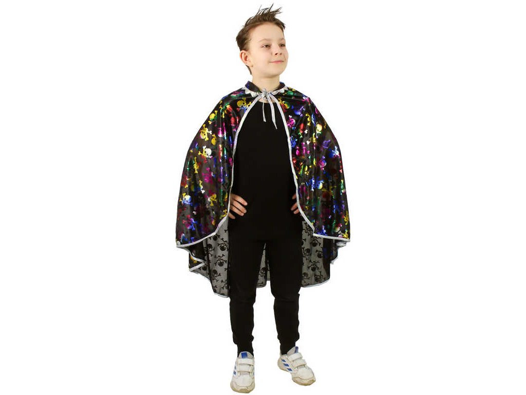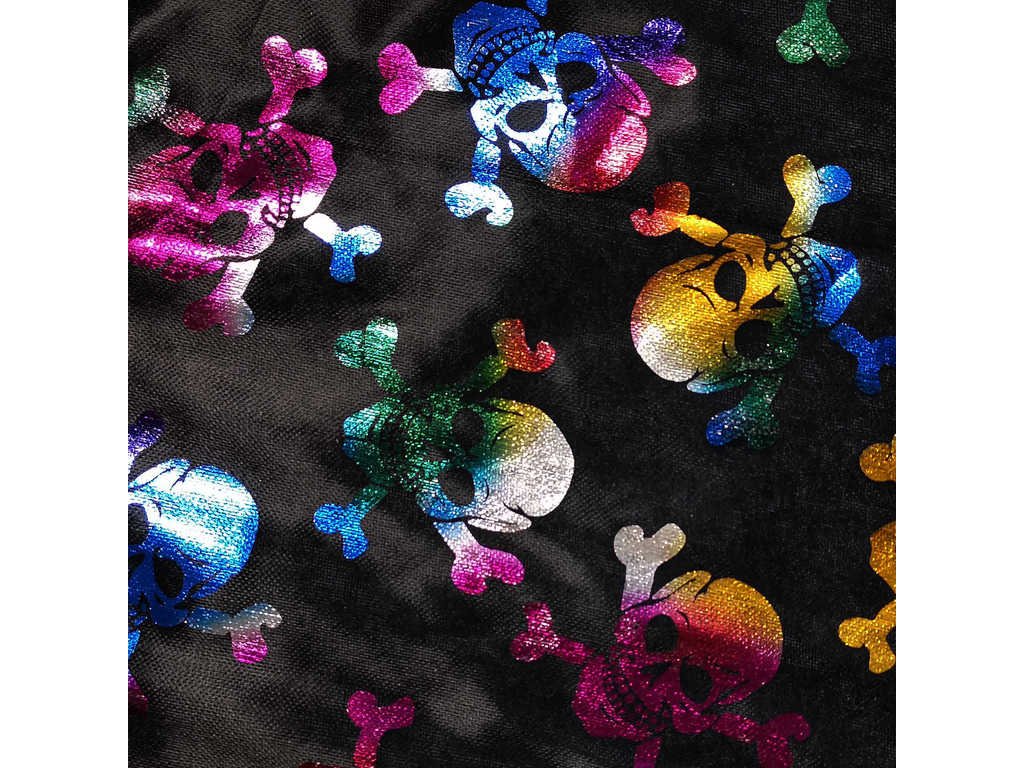 Senzační plášť na zavazování pro všechny čarodějnice a čaroděje! Tento stylový kousek má límeček a je dekorován barevným metalickým potiskem lebek.
