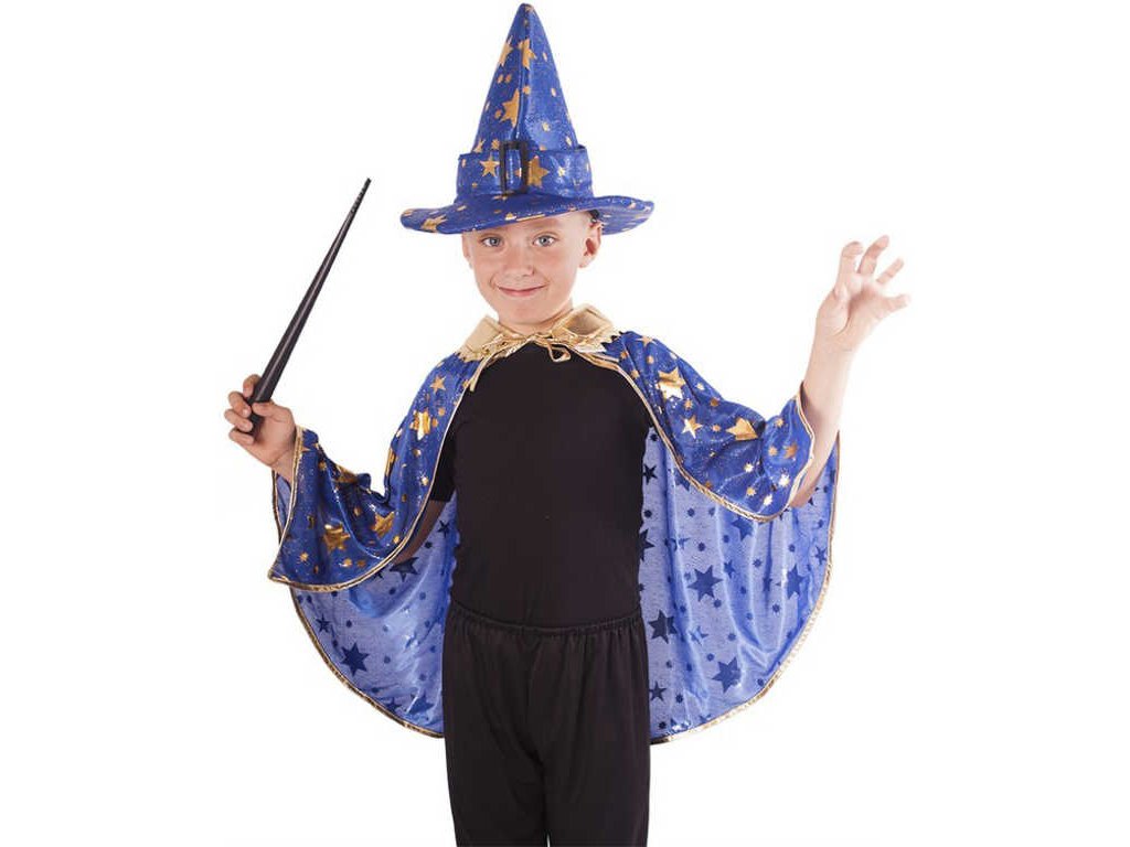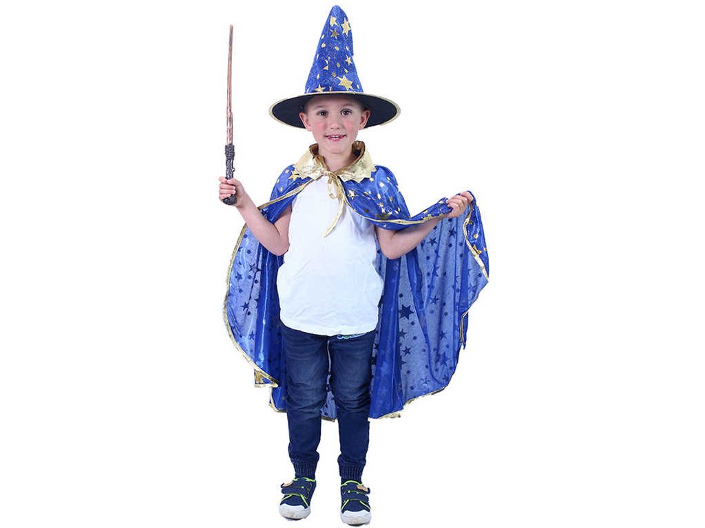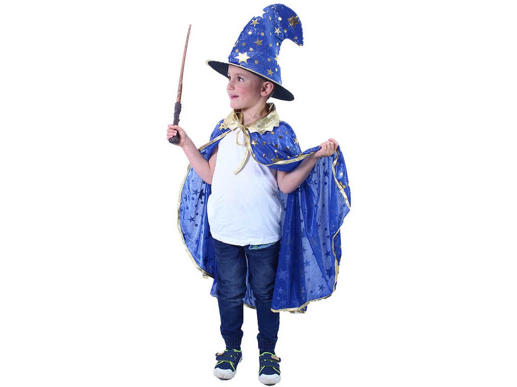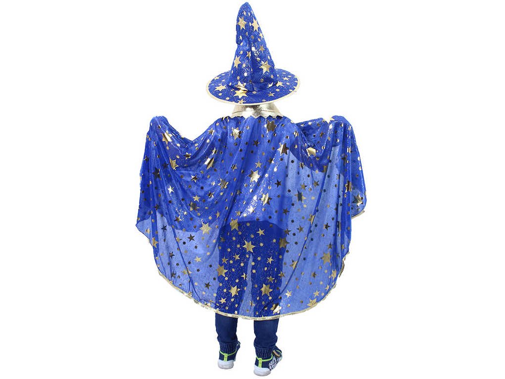 Perfektní souprava pro všechny čarodějnice nebo čaroděje na párty nebo karneval! Balení obsahuje čarodějnický plášť modré barvy se zlatým lemováním a hvězdami a perfektně sladěný klobouk. V těchto exkluzivních