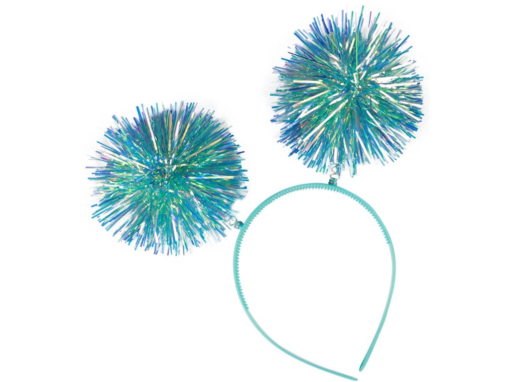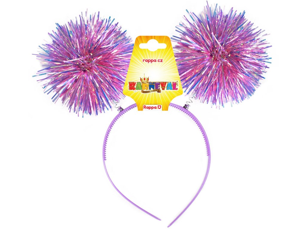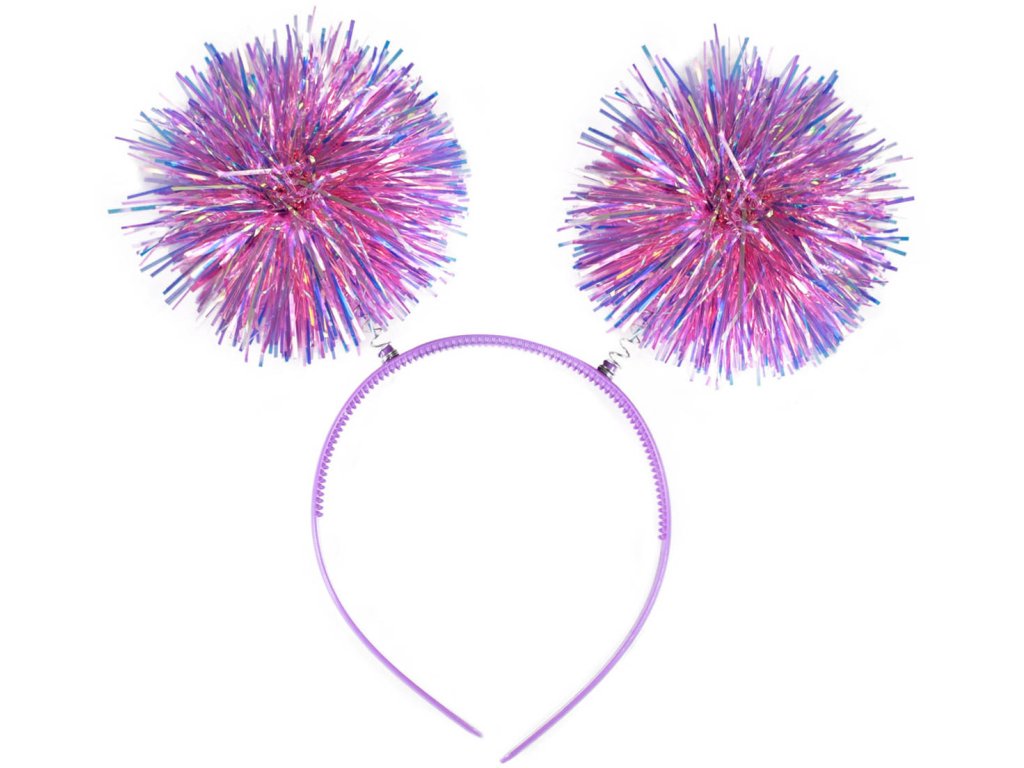 Karnevalová čelenka s třásněmi. Barevná plastová čelenka pom-pom je zdobená třpytivými třásněmi ve tvaru koulí, které jsou připevněny na pružinkách. 2 barevné vavrianty.