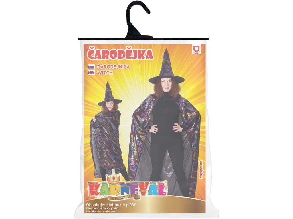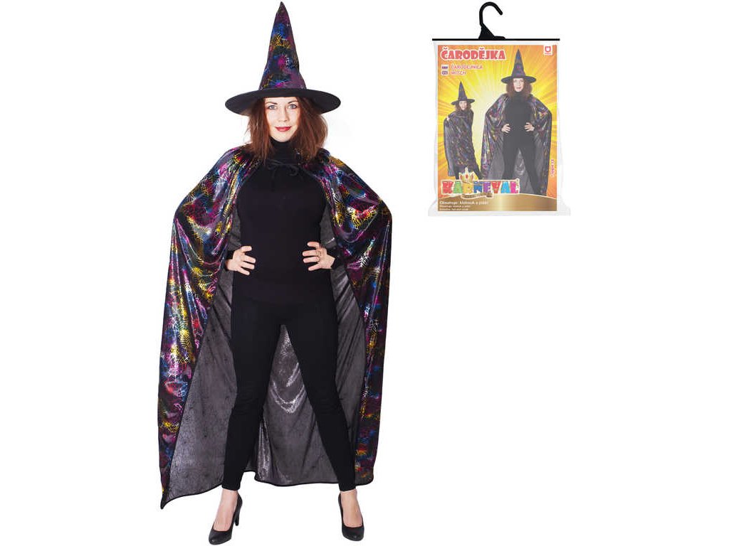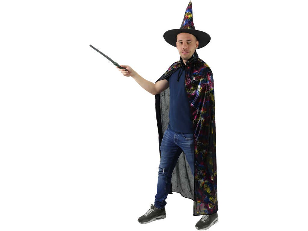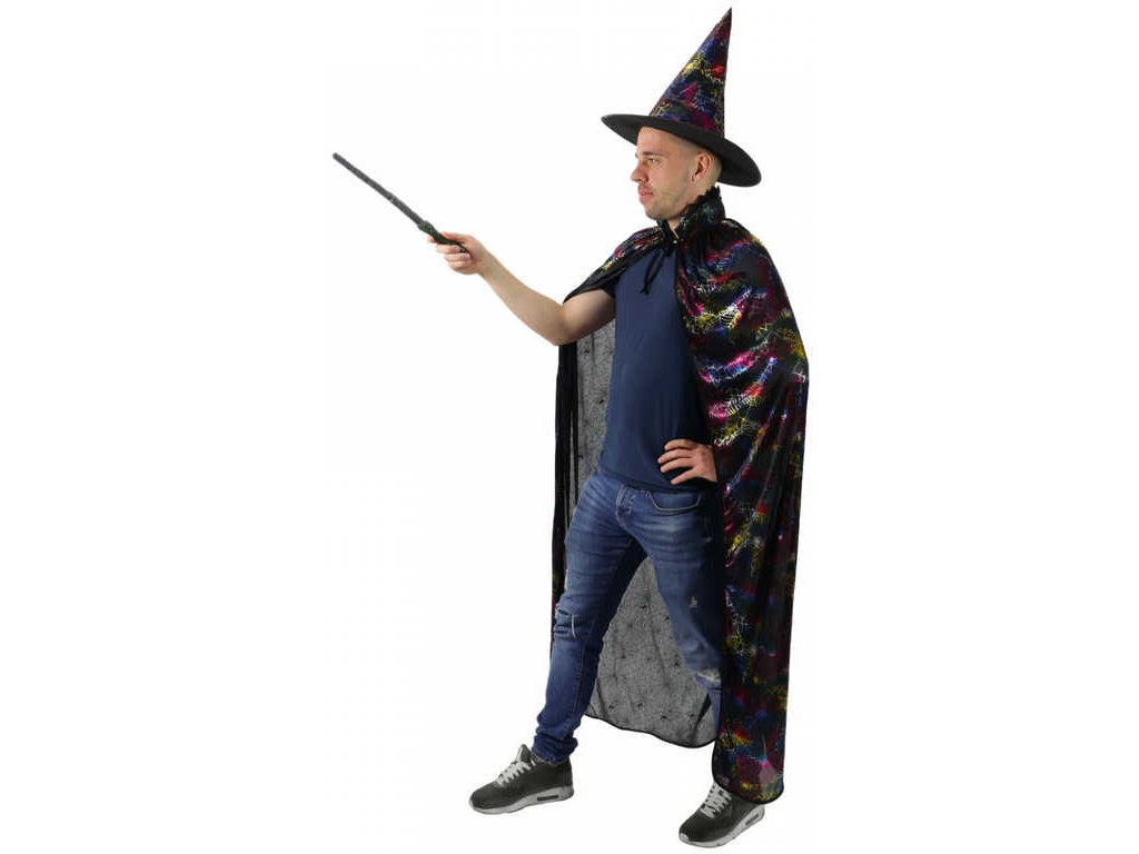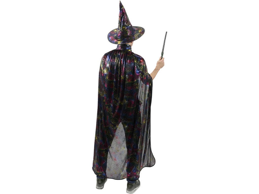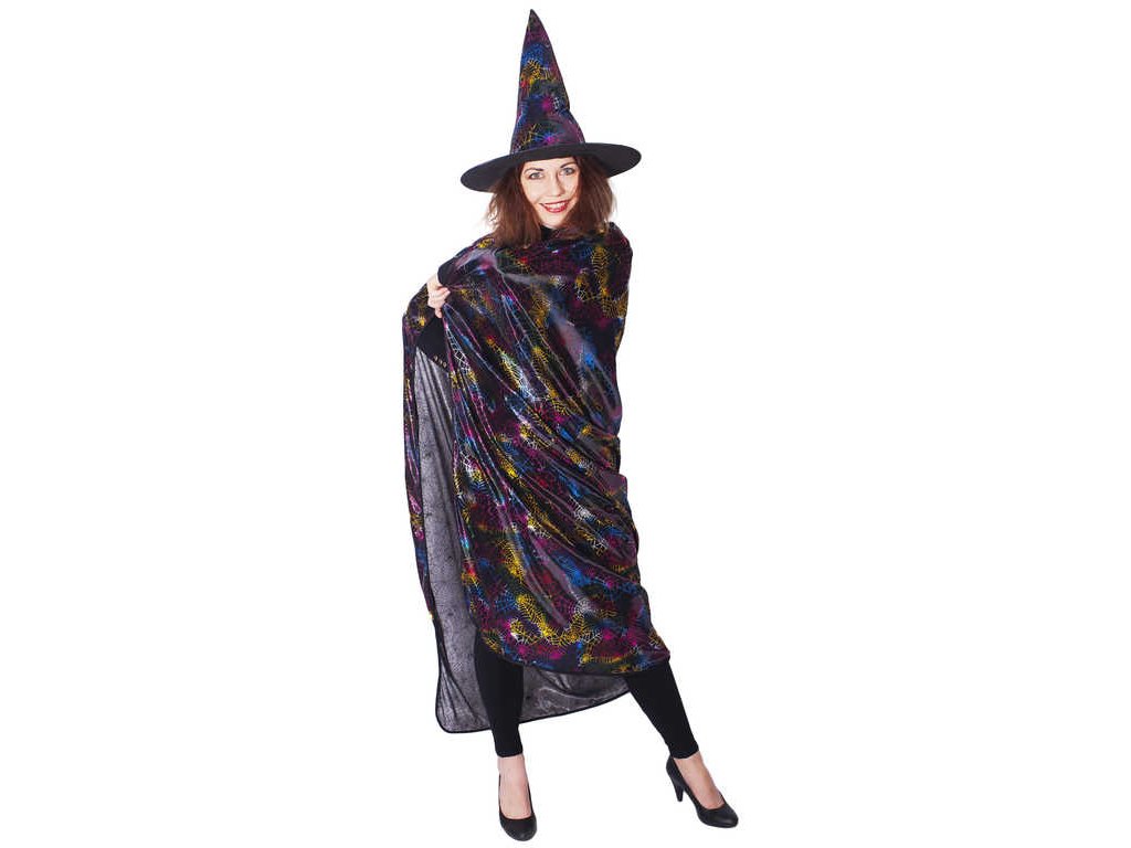 Úžasný černý pavučinový plášť pro všechny čaroděje a čarodějnice! Plášť je určen pro starší děti nebo dospělé a je dekorován potiskem barevných pavučin. Součástí kostýmu je perfektně sladěný špičatý klobouk. Ideální na karneval nebo halloweenskou párty.