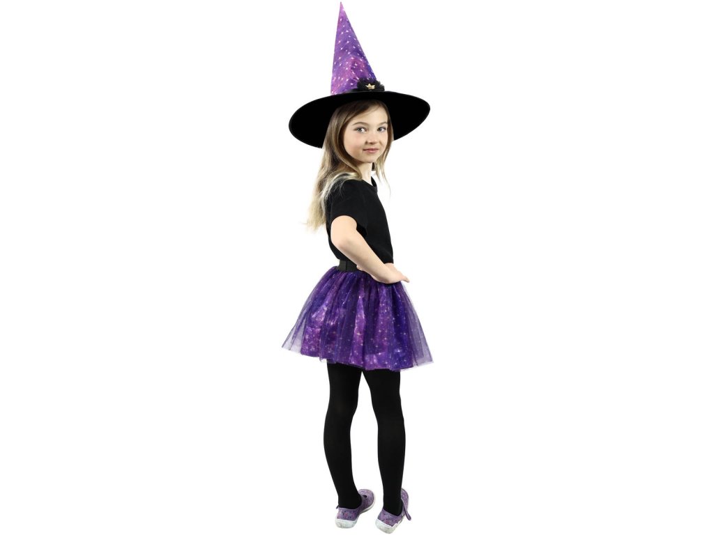 Magický kostýmek fialové barvy zdobený dekorem hvězdiček je určen pro holčičky ve věkovém rozmezí 3-7 let. Balení obsahuje nadýchanou sukničku a k tomu perfektně sladěný špičatý klobouk. Sukně je v pase na gumičku. Vhodné i na halloween.