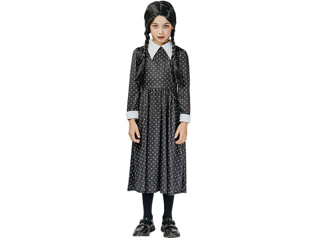 Černé dívčí puntíkované dlouhé šaty s bílým límcem a rukávy "Gotická dívka" holčičí karnevalový kostým. Velikost M, věk 5-9 let, výška postavy 120-130cm. Staň se hvězdou karnevalu!