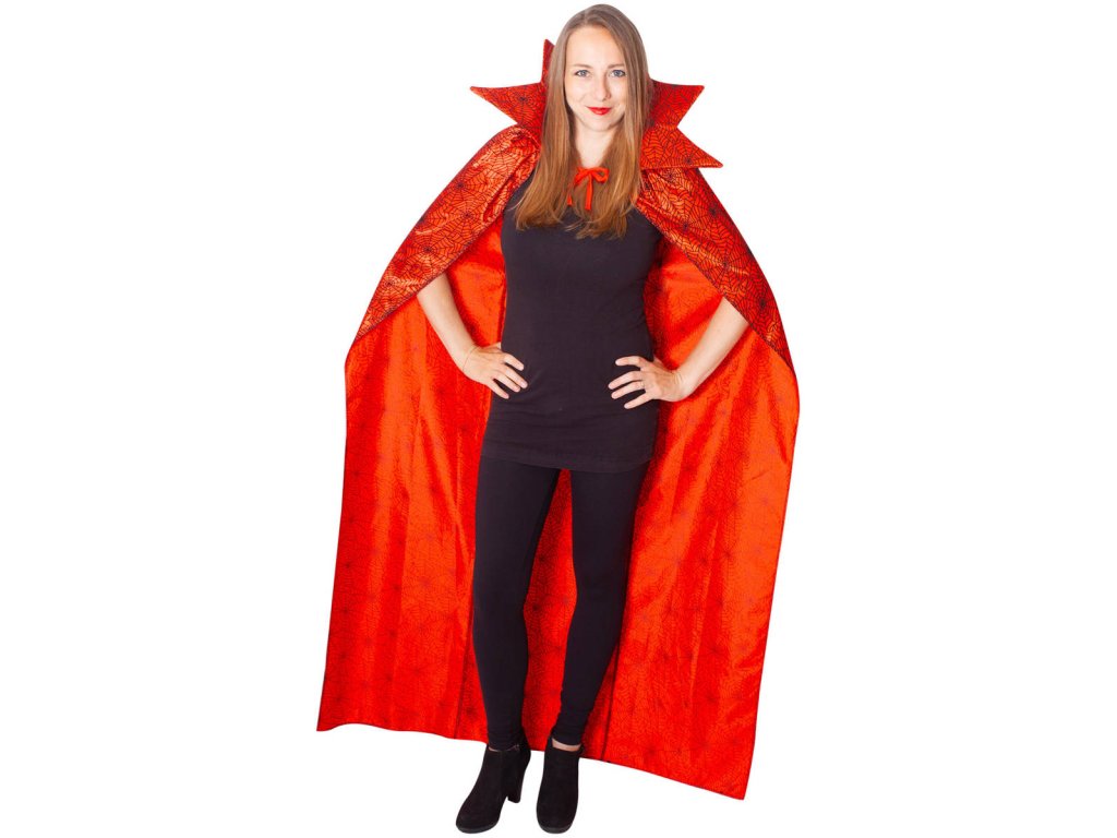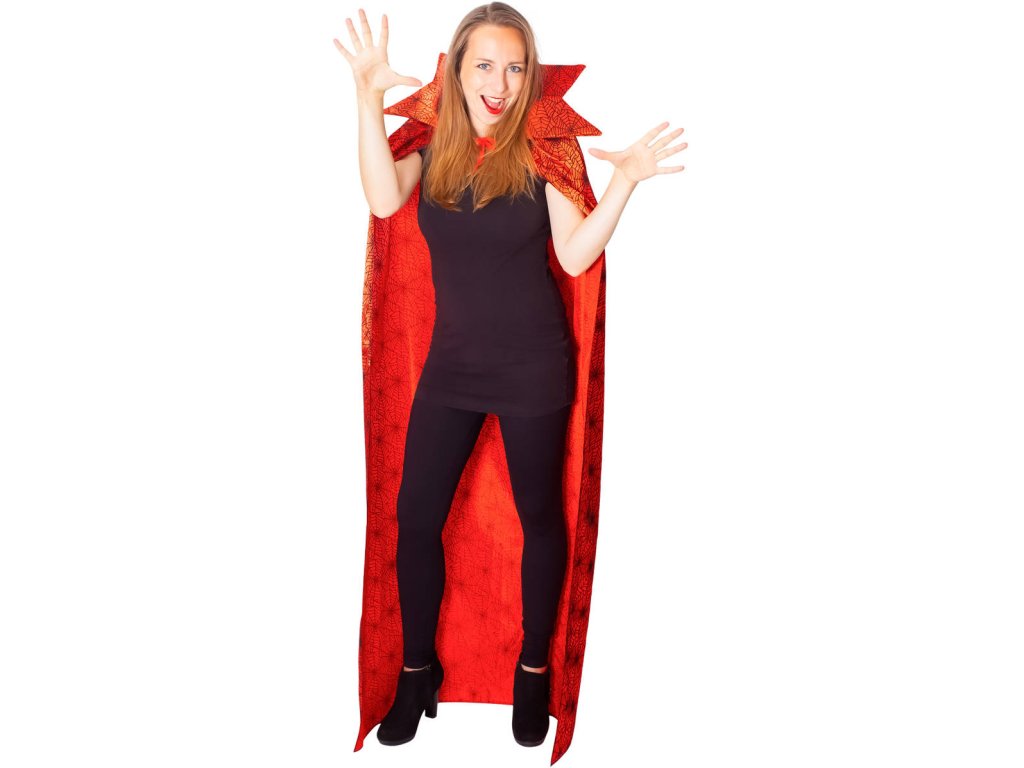 Úchvatný plášť v červené barvě dekorovaný potiskem pavučinky je skvělým doplňkem pro dospělé na Halloween párty nebo karneval.