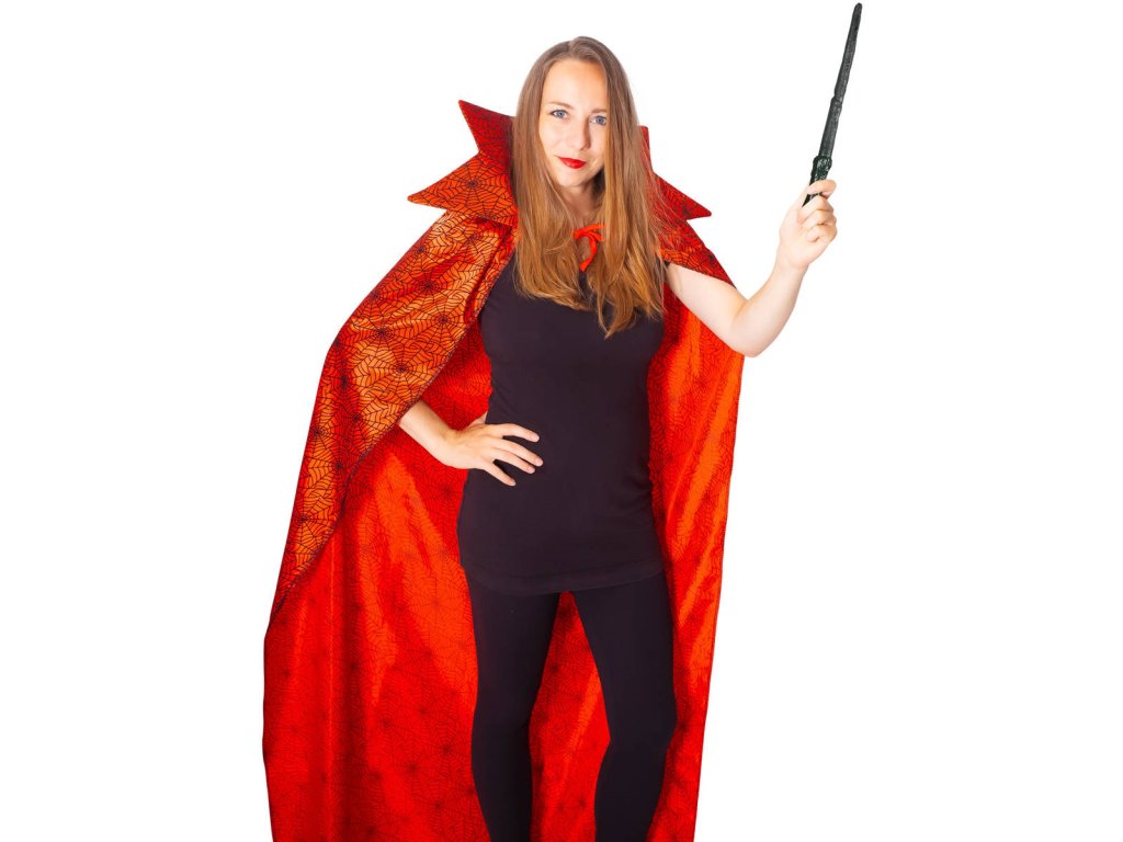 Červený dlouhý pavučinový plášť jako doplněk ke kostýmu čarodějnice, na karneval. Motiv pavučina.