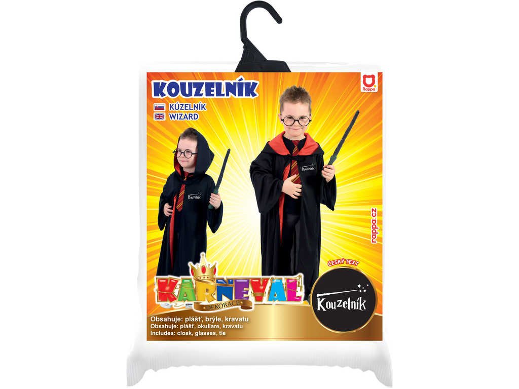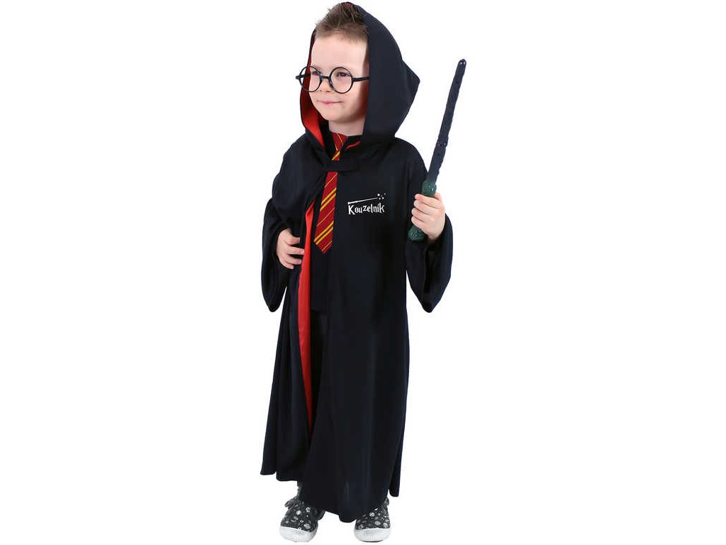 Dětský kouzelnický plášt s kapucí je určen pro všechny holky a kluky ve věkovém rozmezí 3-7 let (104-136 cm). Plášť černo-červené barvy se zapínáním u krku je na levé straně zdoben nápisem Kouzelník.