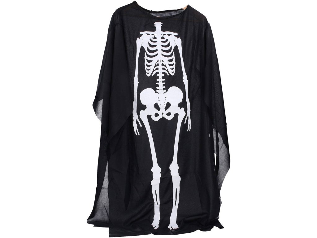 Černý plášť s kostrou bude skvělým doplňkem na halloweenskou párty nebo karneval. Délka pláště: 88cm. Karnevalový převlek Kostra (Kostlivec).