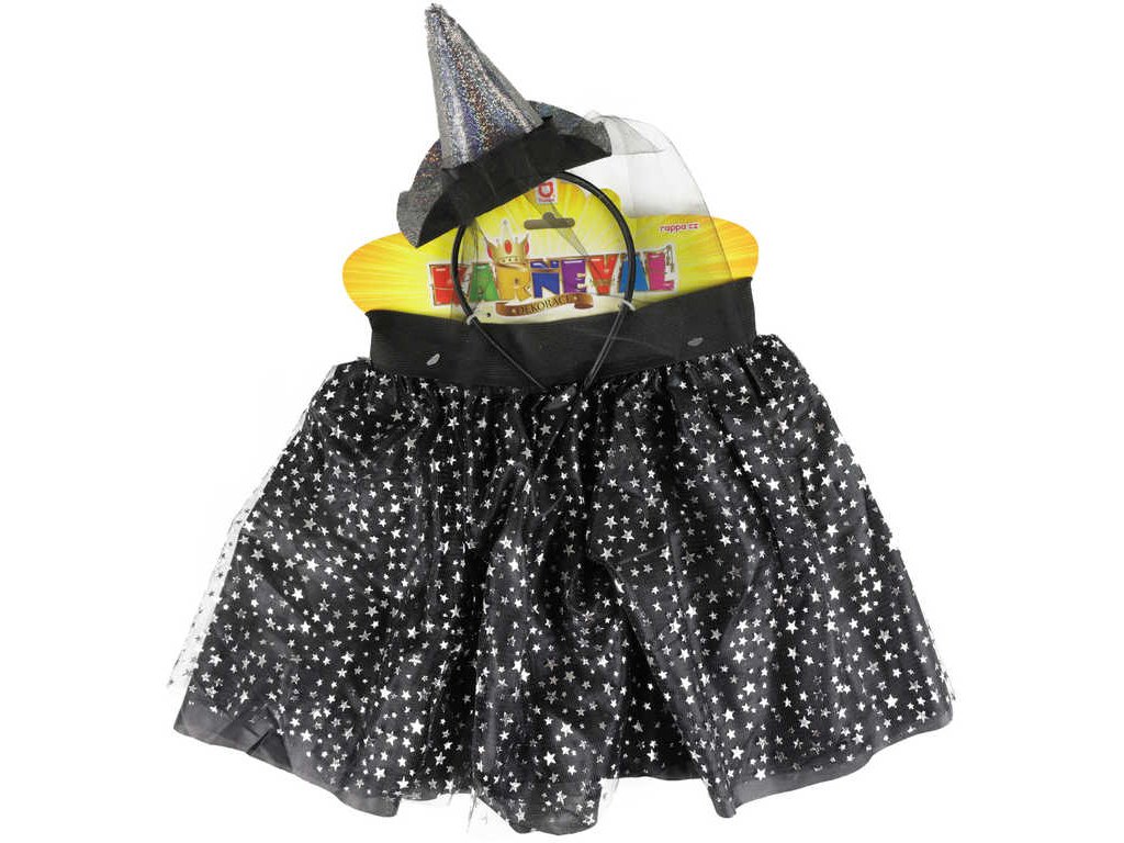 Bezva sada pro všechny malé parádnice čarodějnice! Sukýnka má černou spodničku, překrytou tylem s potiskem stříbrných hvězdiček. Set je doplněn o čelenku s kloboučkem, který perfektně ladí k sukýnce. Skvěle se hodí i na oslavu Halloweenu nebo karneval!
