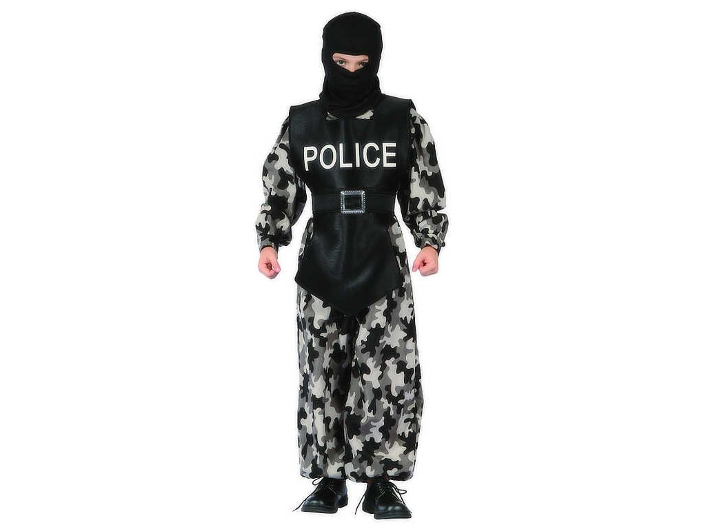 Šedočerné šaty Policie, vzor maskáč, s kuklou na hlavu - obleček na karneval pro všechny malé policisty nebo členy elitní zásahové jednotky.
