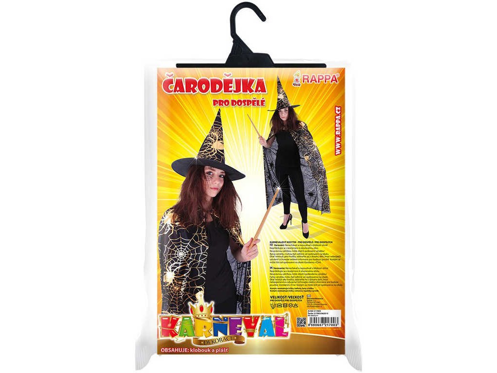 Krásný komplet na karneval nebo Halloween! Souprava zahrnuje černý plášť, který je dekorován halloweenskými motivy zlaté barvy a perfektně sladěný klobouk. Senzace! Doporučeno pro dospělé.
