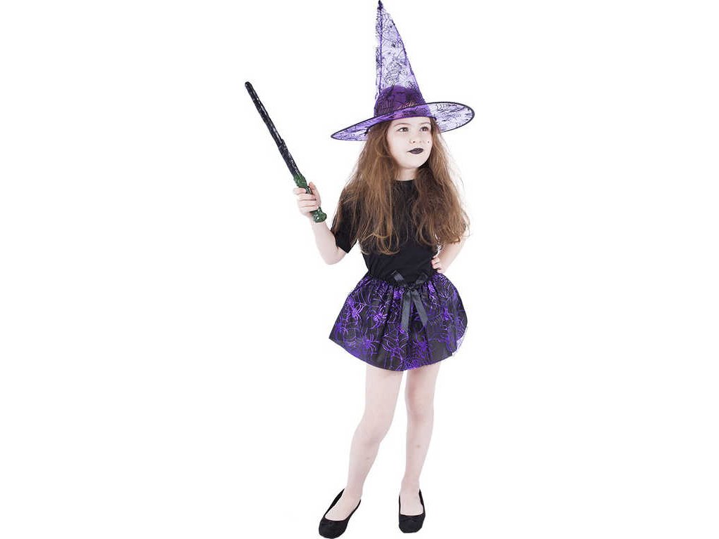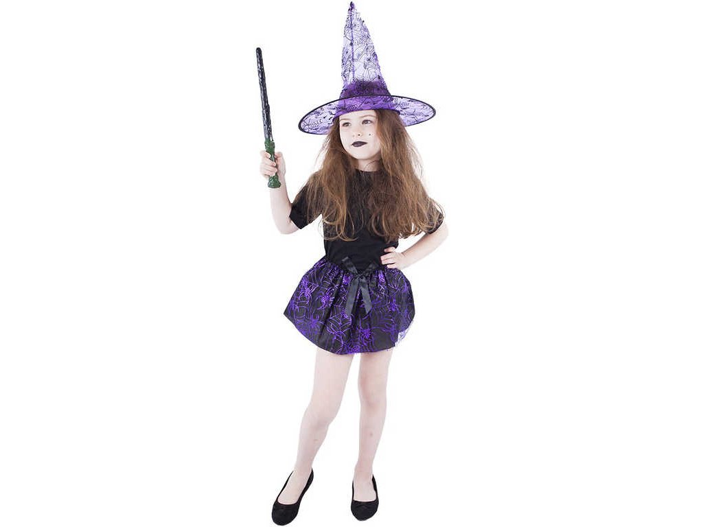 Magická sukýnka pro všechny malé čarodějnice! Kostýmek černé barvy zdobený fialovým dekorem pavučinky je určen pro holčičky ve věkovém rozmezí 3-10 let (104-150 cm). Balení obsahuje nadýchanou sukničku a perfektně sladěný klobouk ve fialové barvě s potiskem pavučiny. Perfektní souprava na Halloween párty nebo karneval!