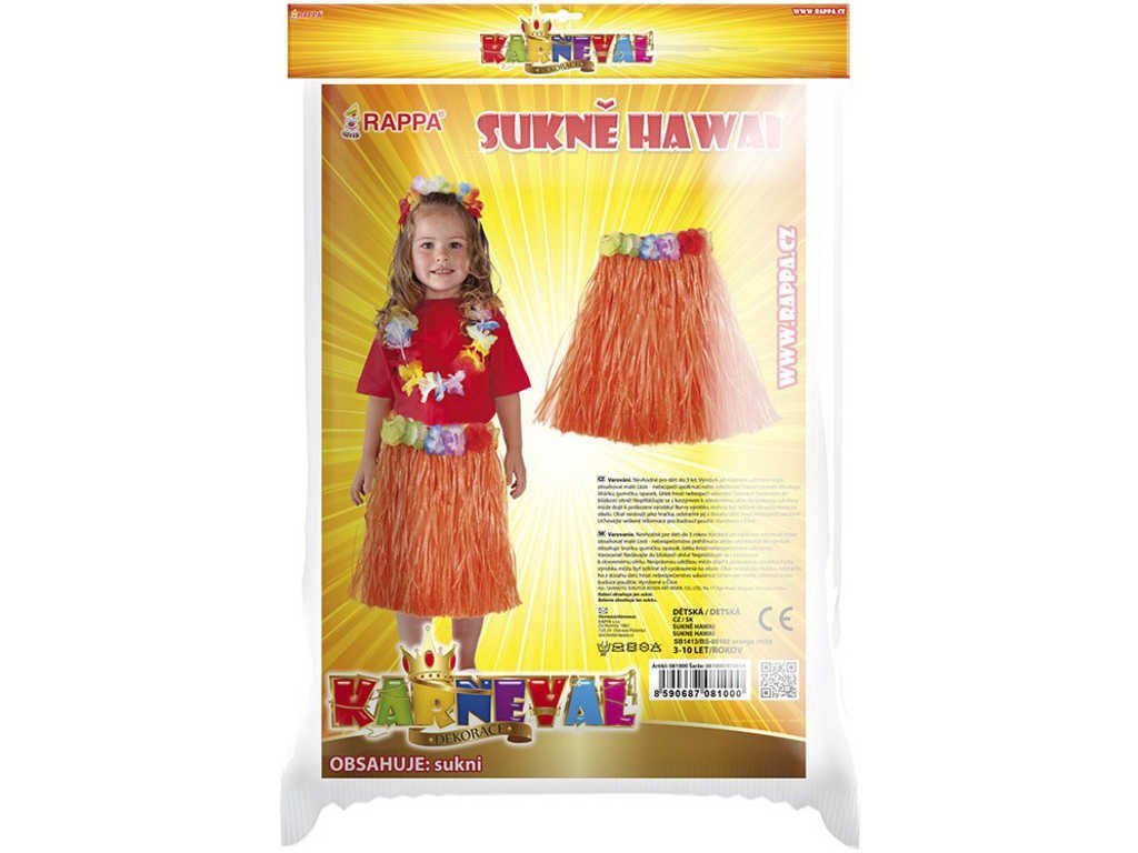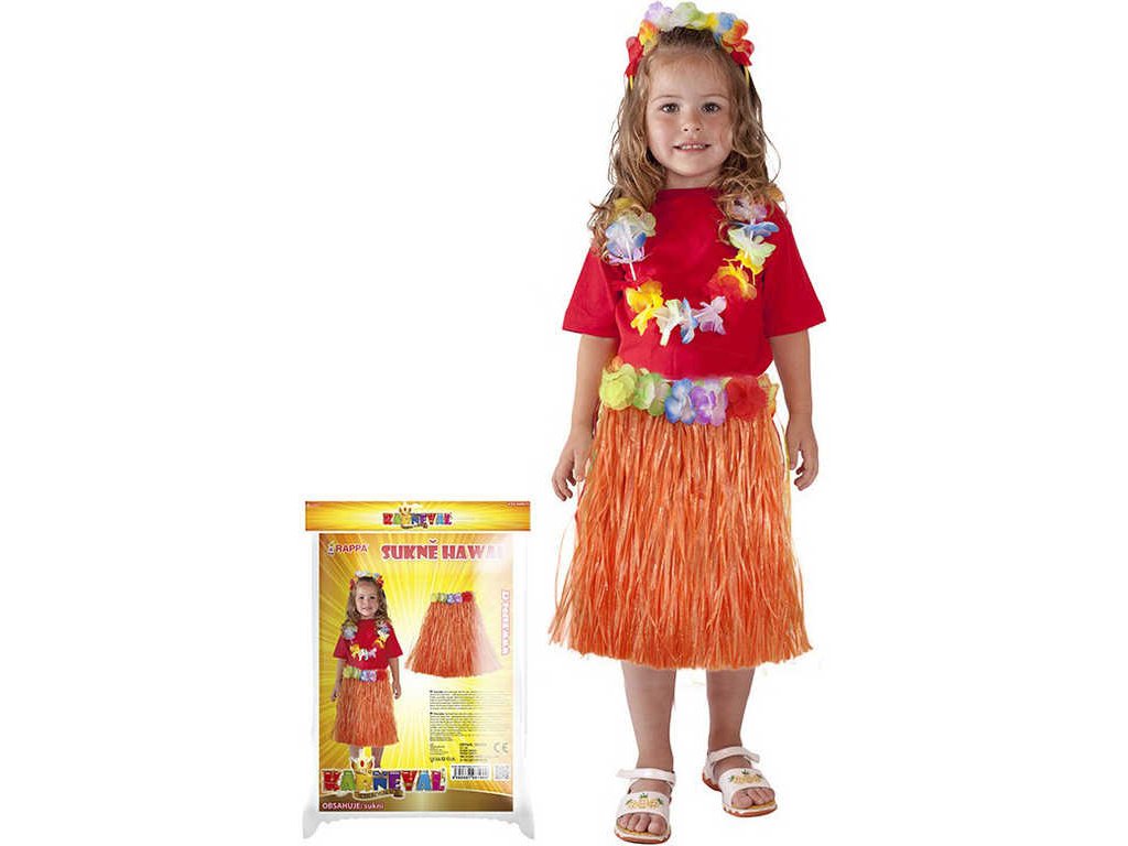Parádní sukénka s třásněmi ve stylu "Havaj" nesmí žádné slečně v šatníku chybět! Tento senzační kousek je ideálním doplňkem na karneval nebo k typickému havajskému tanci "HULA". Sukně, dlouhá 45 cm, je vyrobena z tenkých igelitových pásků v oranžové barvě a zdobena barevnými okvětními lístky. Paráda! Staň se hvězdou karnevalového večírku díky této havajské sukni nebo si vytvoř celý havajský kostým! Balení obsahuje pouze sukni.